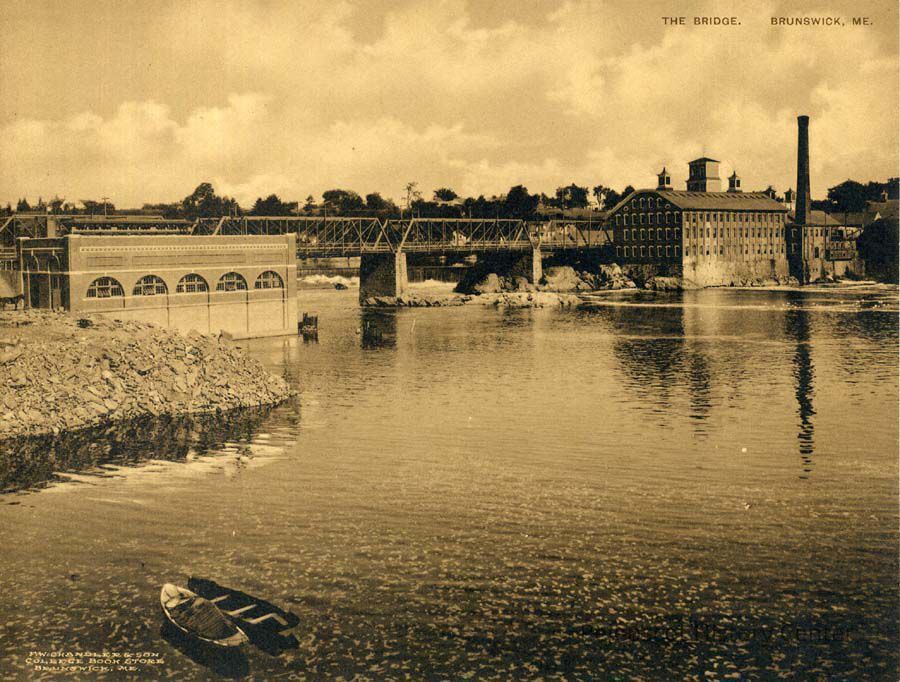 A Sepia postcard view of the Bowdoin Mill & Iron Bridge. The photo was taken from the Brunswick side looking upstream. The Central Maine Power Company generating station can be seen. Undated