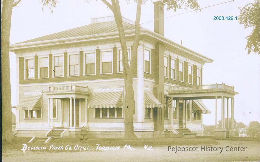 A undated black and white postcard shows the office of the Bowdoin Paper Co., in Topsham, Maine.