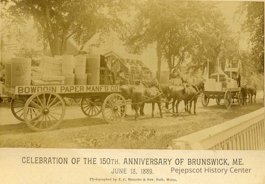 Celebrations - Brunswick, Celebrations - 150th Anniversary of Brunswick, Anniversaries - Brunswick, Parades - Brunswick, Bowdoin Paper Manufacturing Co., Horses, Wagons, Paper industry, Paper industry - Maine, Paper Making