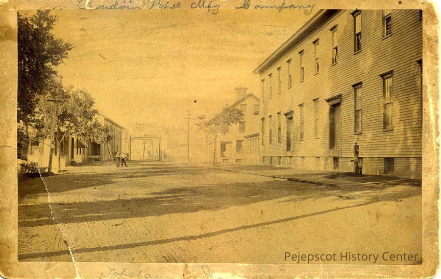A B/W photo of the approach to the old bridge over the Androscoggin River. Looking south from Topsham between buildings of the Bowdoin Paper Mfg. Co.