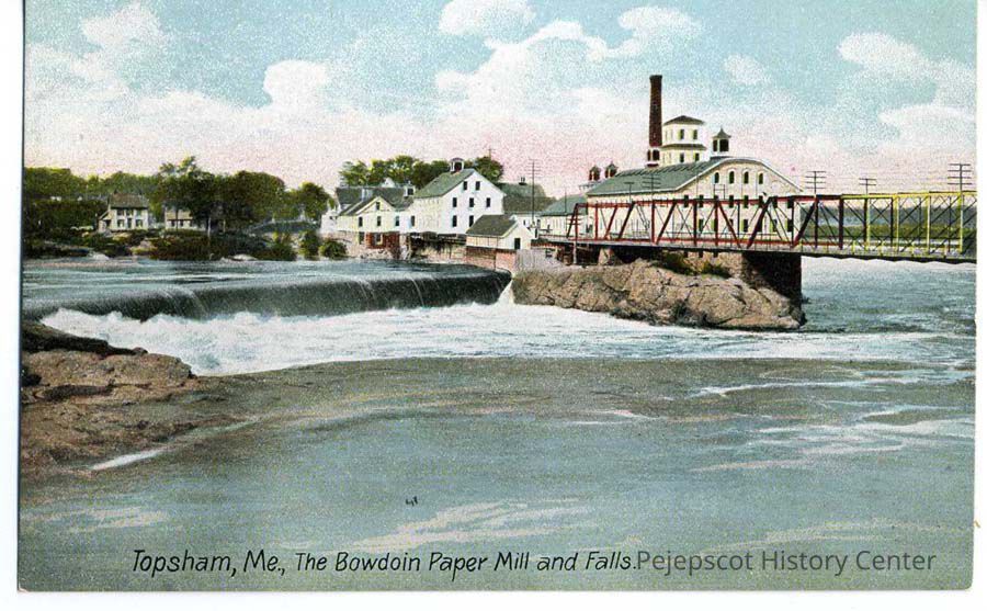 Color post card of the Androscoggin River Falls and the Bowdoin Paper Mill.