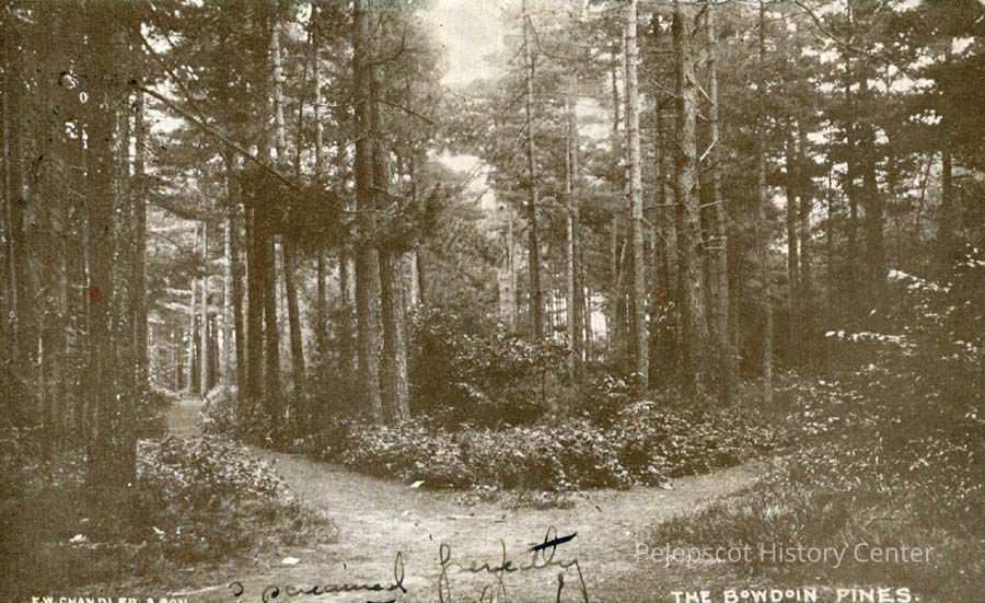 A B/W picture postcard view of the Bowdoin Pines, Brunswick, ME. Dated 12/7/1907.
