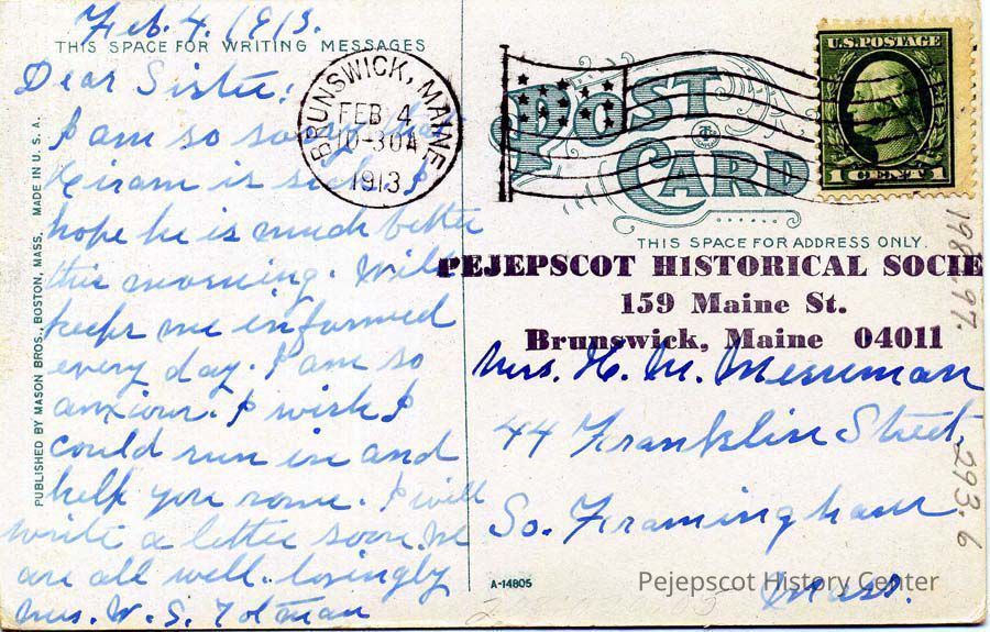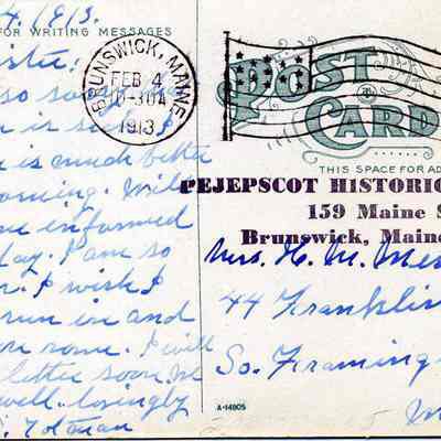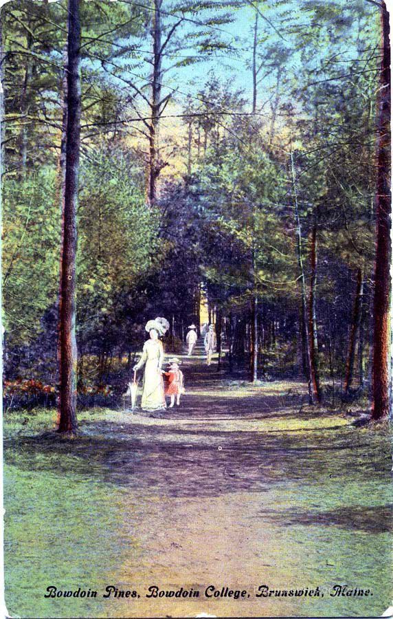 Color postcard of the Bowdoin Pines. From Mrs. W.S. Toothaker (?) to Mrs. H. M. (Annie) Merriman, 44 Franklin Street, South Framinham, Mass. Postmarked Brunswick, Feb. 4, 1913.
