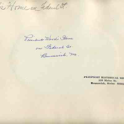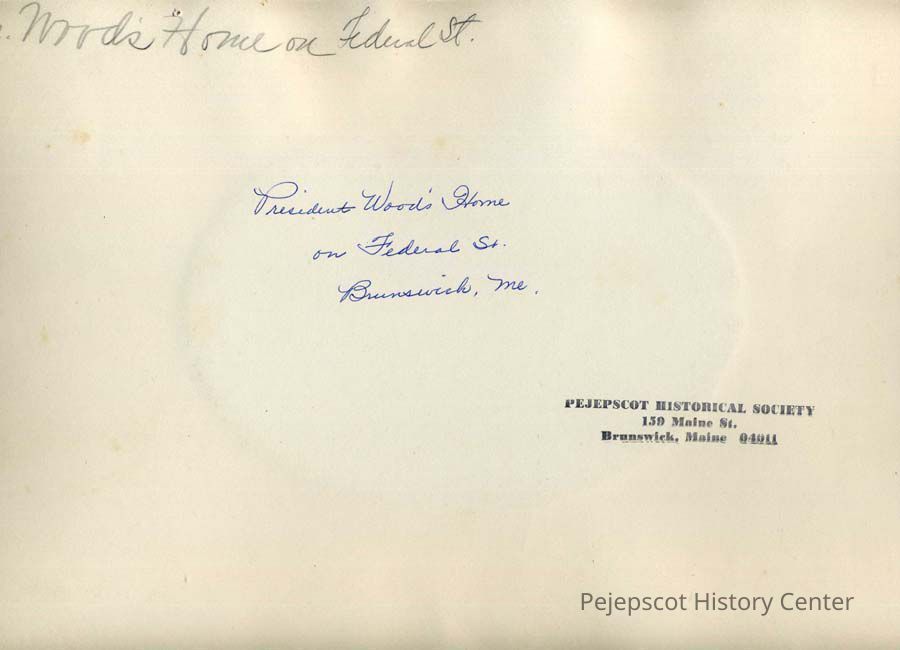 B/W oval photo of the house of the Bowdoin College President, Leonard Woods (1839-1866), 7 Federal Street, Brunswick.