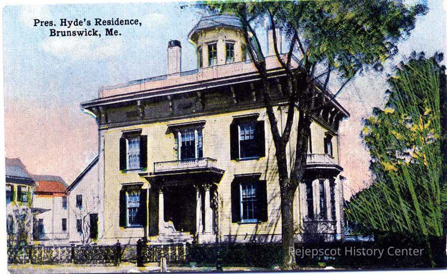 Miniature color postcard of "President Hyde's residence", aka the President's House, at the corner of Federal Street and Bath Road. 85 Federal Street (dupe of 1990.22.1f)Lexicon