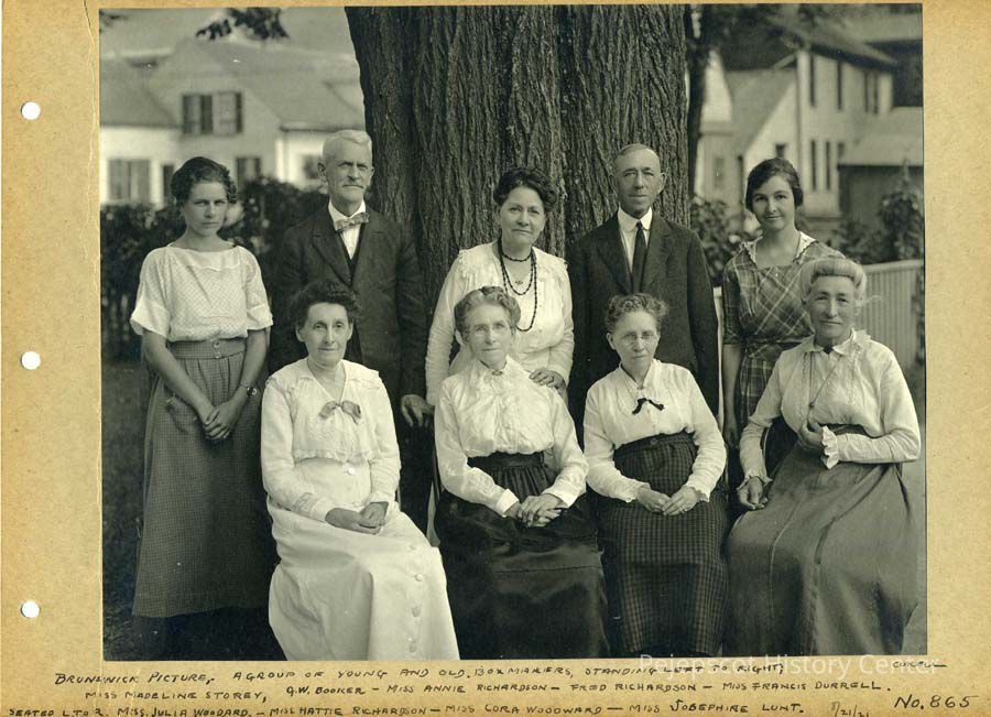 A black and white photo of young and old boxmakers. Standing left to right: Madeline Storey; G.W. Booker; Annie Richardson; Fred Richardson; Francis Durrell. Seated left to right: Julia Woodward; Hattie Richardson; Cora Woodward; Josephine Lunt. Undated