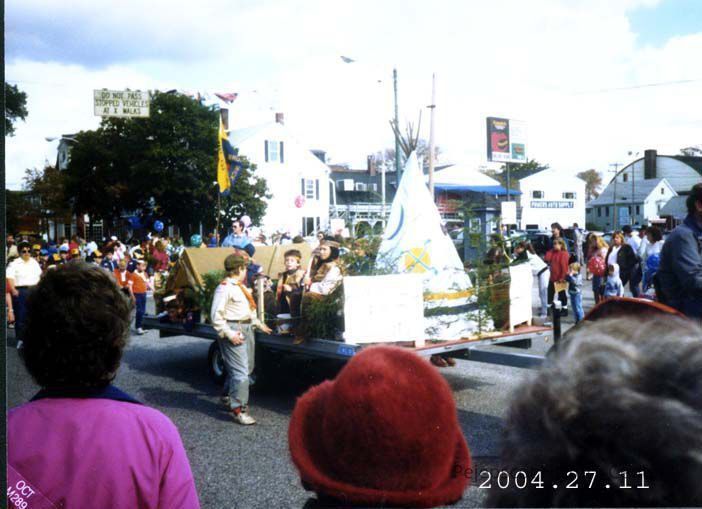 A color photograph of Brunswick's 250th Anniversary Parade (Oct 1989) showing the Boy Scouts float. Amato's sign is in the background.