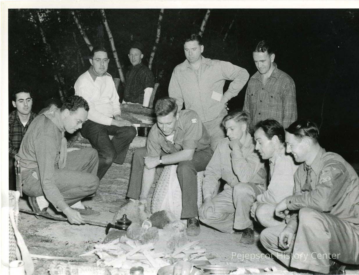 Ten men pictured at night around what may be an unlit camp fire. The caption reads "Boy Scouts, Troop 182." Of the ten men only two are identified; 1.) Joseph La Beau and 6.) Ulmont Nickerson. Undated