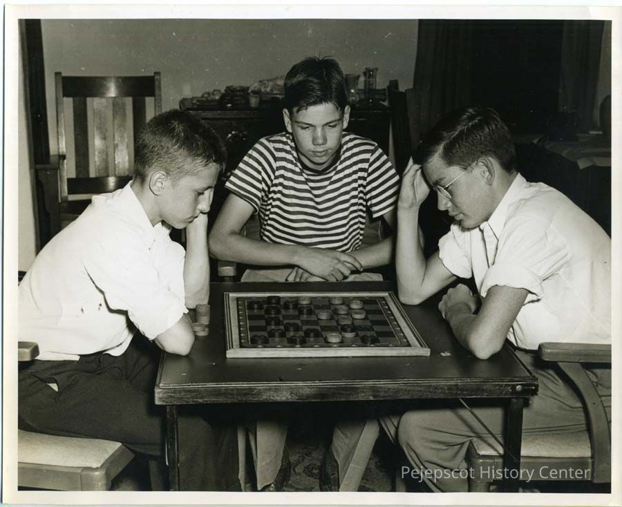 Photo of three boys sitting around checkers board. Raymond McCrum and Richard Lancaster identified, though who is who is not known. Undated