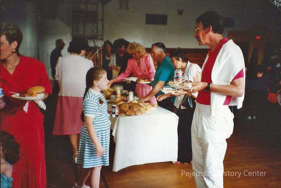 A color photograph of the buffet luncheon with Brad Adams talking to Carol Choate's daughter.Lexicon
