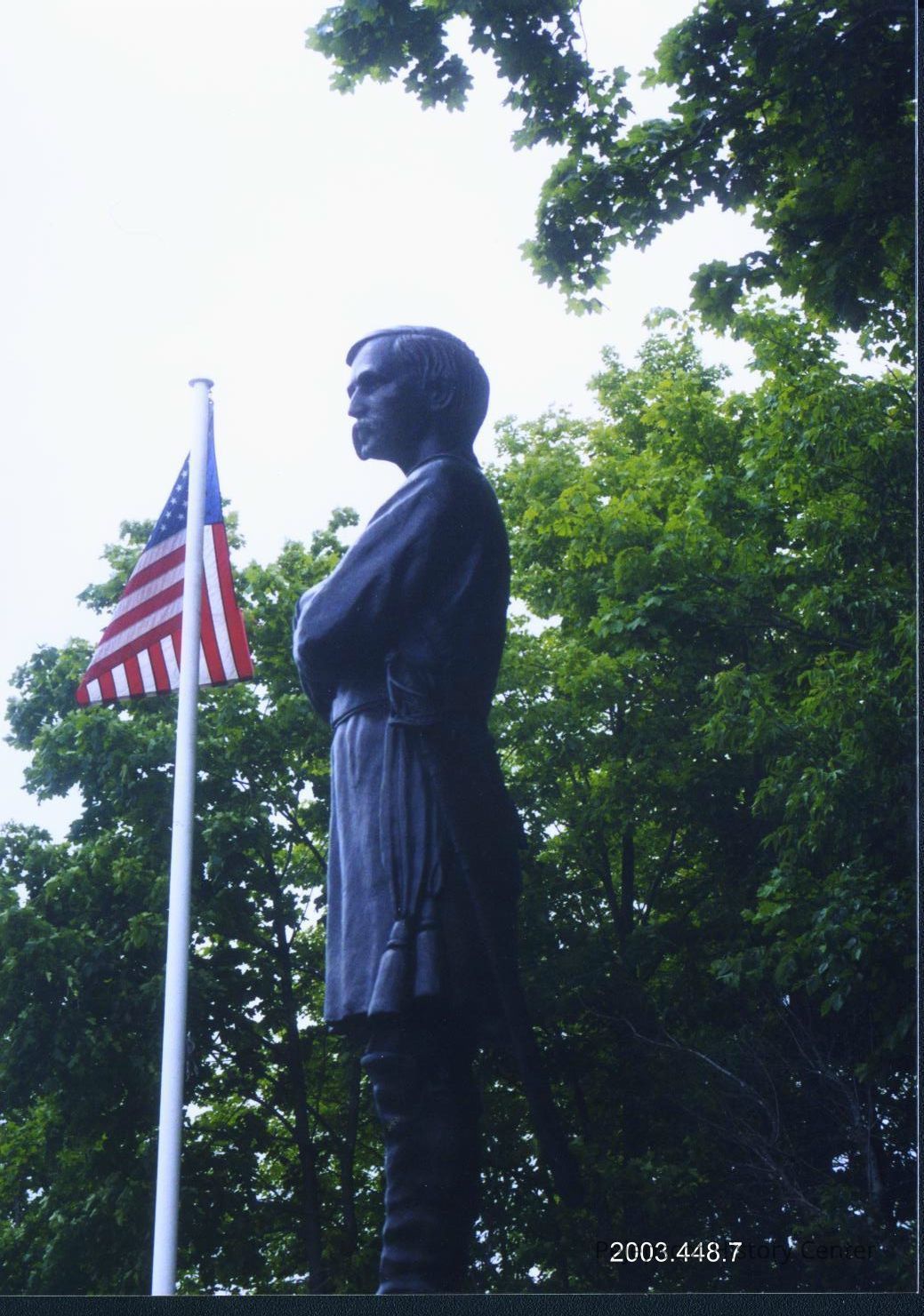 A color photograph of the Joshua L. Chamberlain statue in Brewer, Maine, was taken in August 2003.