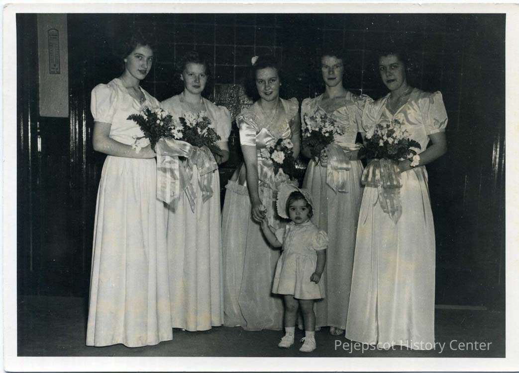 Four bridesmaids and a bride pose for the camera with a small girl. Second from the right is Constance Hayes (Gagnon). Undated