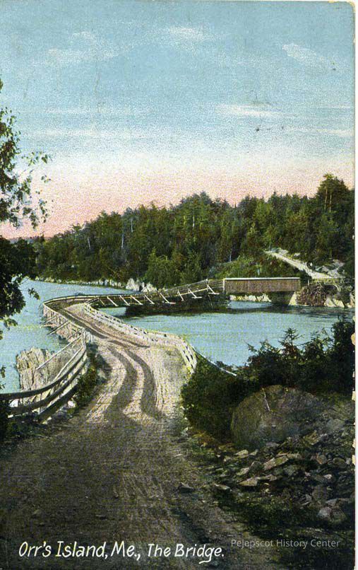An undated color postcard of the old bridge between Orr's Island and Sebascodegan (Great) Island, Harpswell, Maine.Lexicon