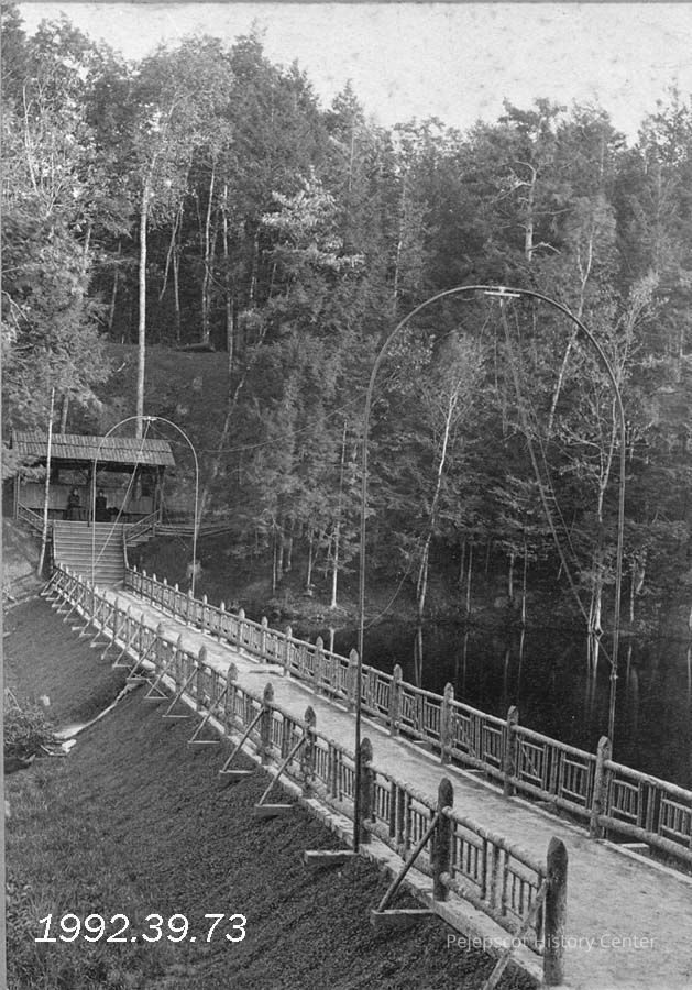 The walking bridge at Merrymeeting Park in Brunswick. Merrymeeting Park was an amusement area at the end of the trolley line. It included nature trails, a casino, zoo, pond, and a stage for performances.Collection