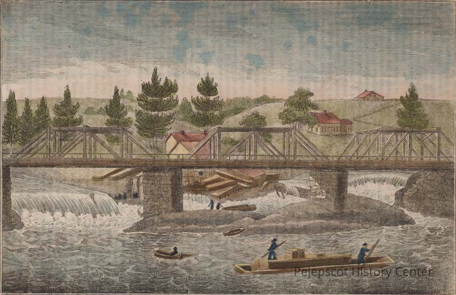 A hand-colored engraving of a bridge over the Androscoggin River which appeared in "The American Magazine of Useful Knowledge". No date.
