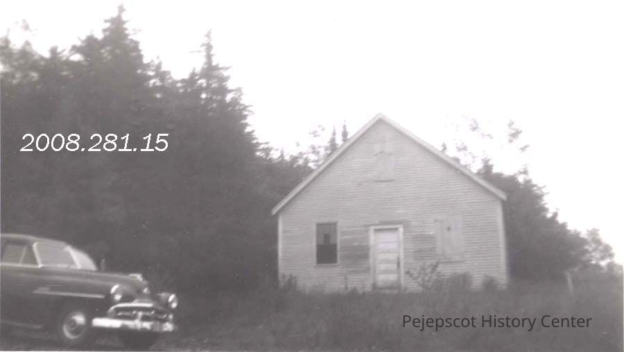 A B/W photo of the Brown School. It shows a wood frame building sitting near some trees. There is a car parked in front. Marked on the back, "Brown." Undated.