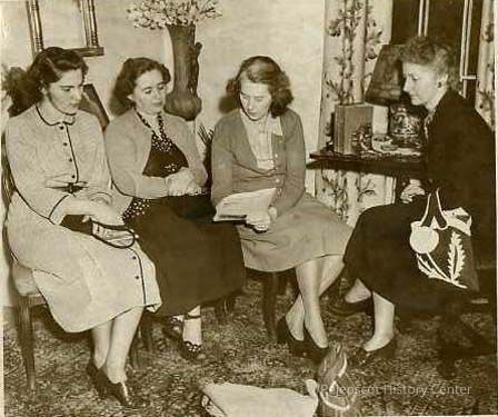 A B/W photograph of Brownie Troop Leaders. They are (l to r) Mrs. Charlotte Parker, Mrs Ruth Courier, Mrs. Guy Young, Chairman of the Training Committee and Mrs. William K. Hall. UndatedCollection