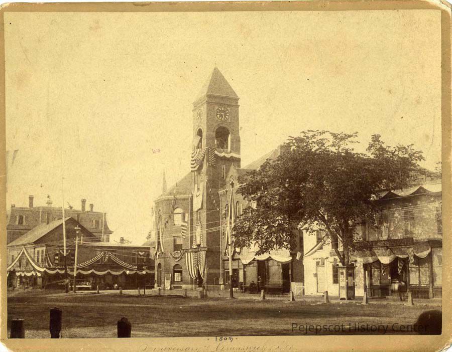 Brunswick, 150th Anniversary - Brunswick, Streets-Maine, Anniversaries - Brunswick, Decoration, Town Hall - Brunswick, Brackett Block, Brunswick Boot, Senter's, Photographers - A. O. Reed, Photographers - Brunswick, Cumberland Street, Architecture, c