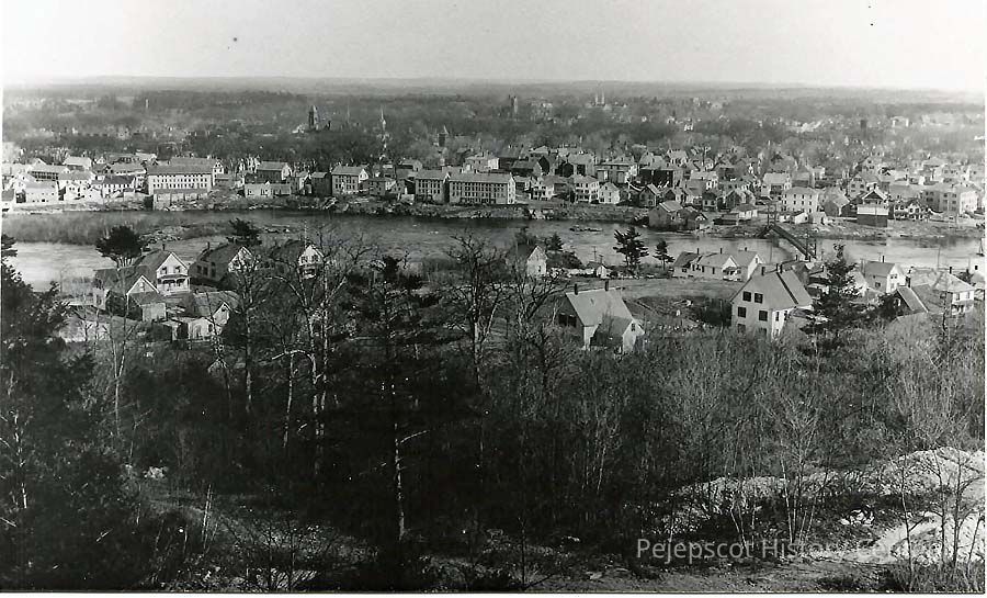 An aerial B/W photograph of Brunswick looking from overhead Topsham.