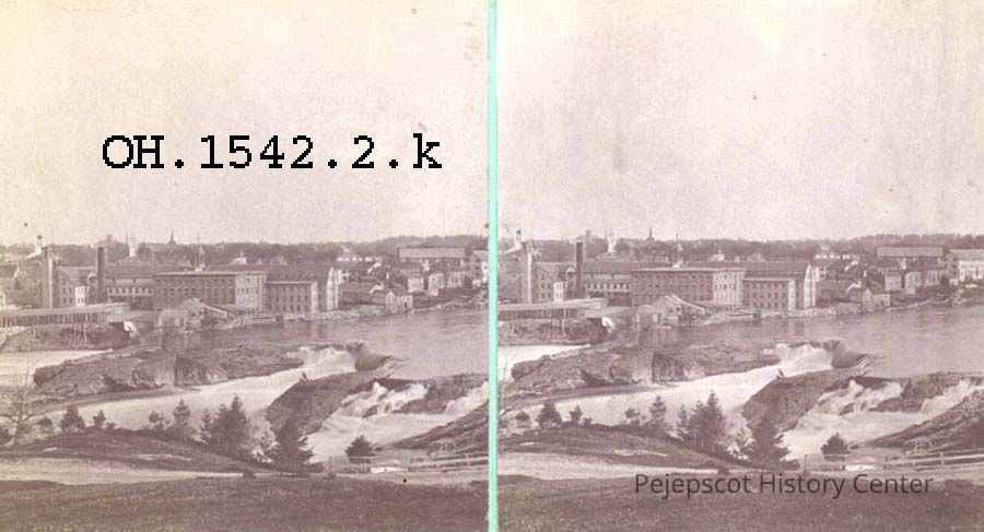 A B/W stereo view of Brunswick, ME taken from a high point in Topsham. It shows the falls on the Androscoggin as well as Cabot Mill. Undated