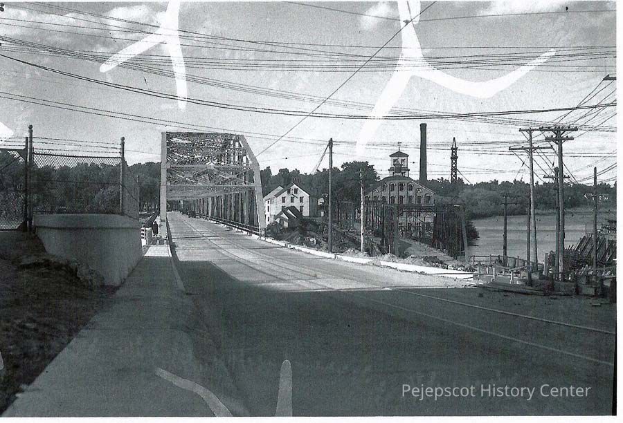 A B/W photo of the new (1932) and old Bridges across the Androscoggin River. 07/03/1932Lexicon