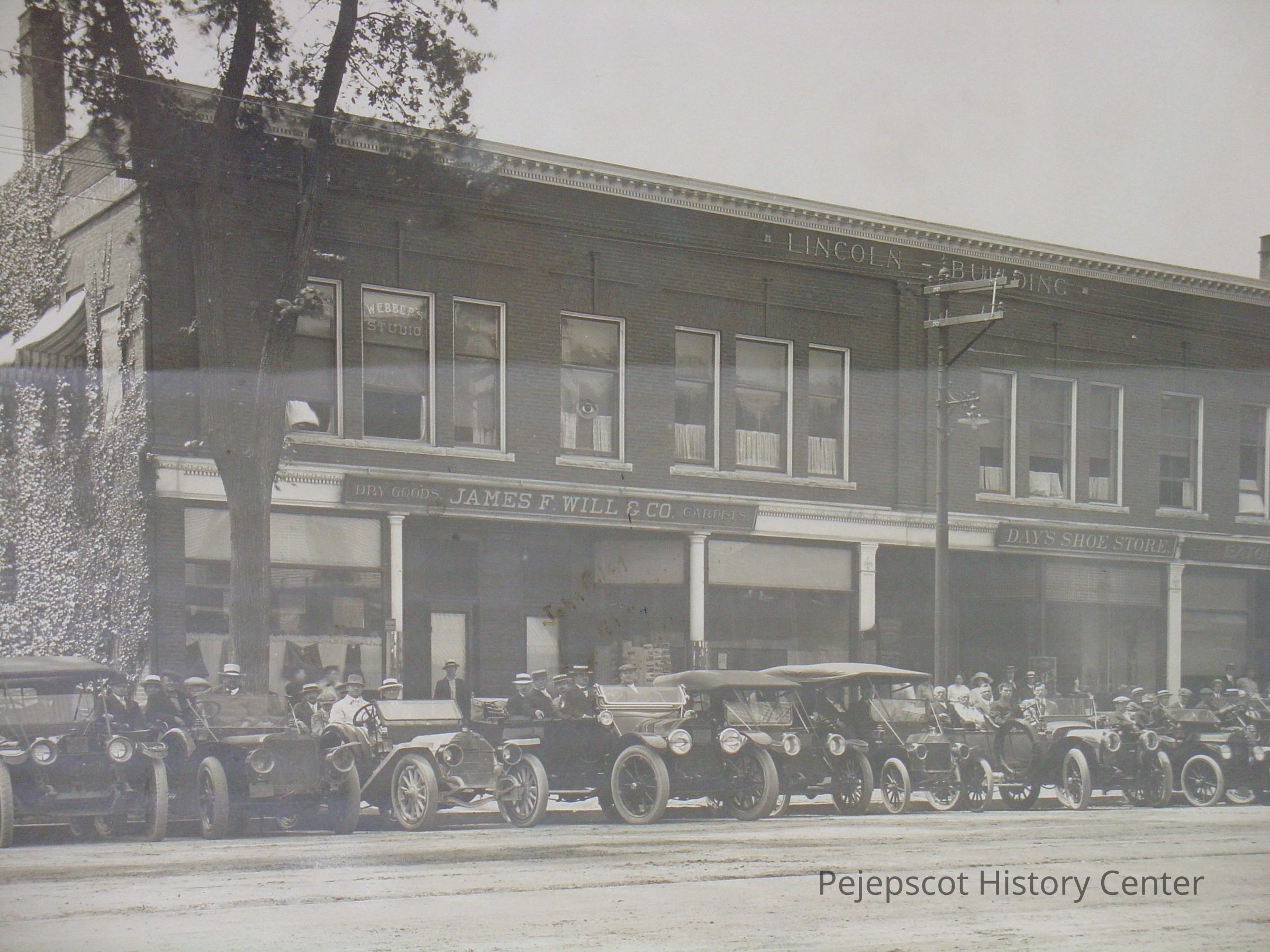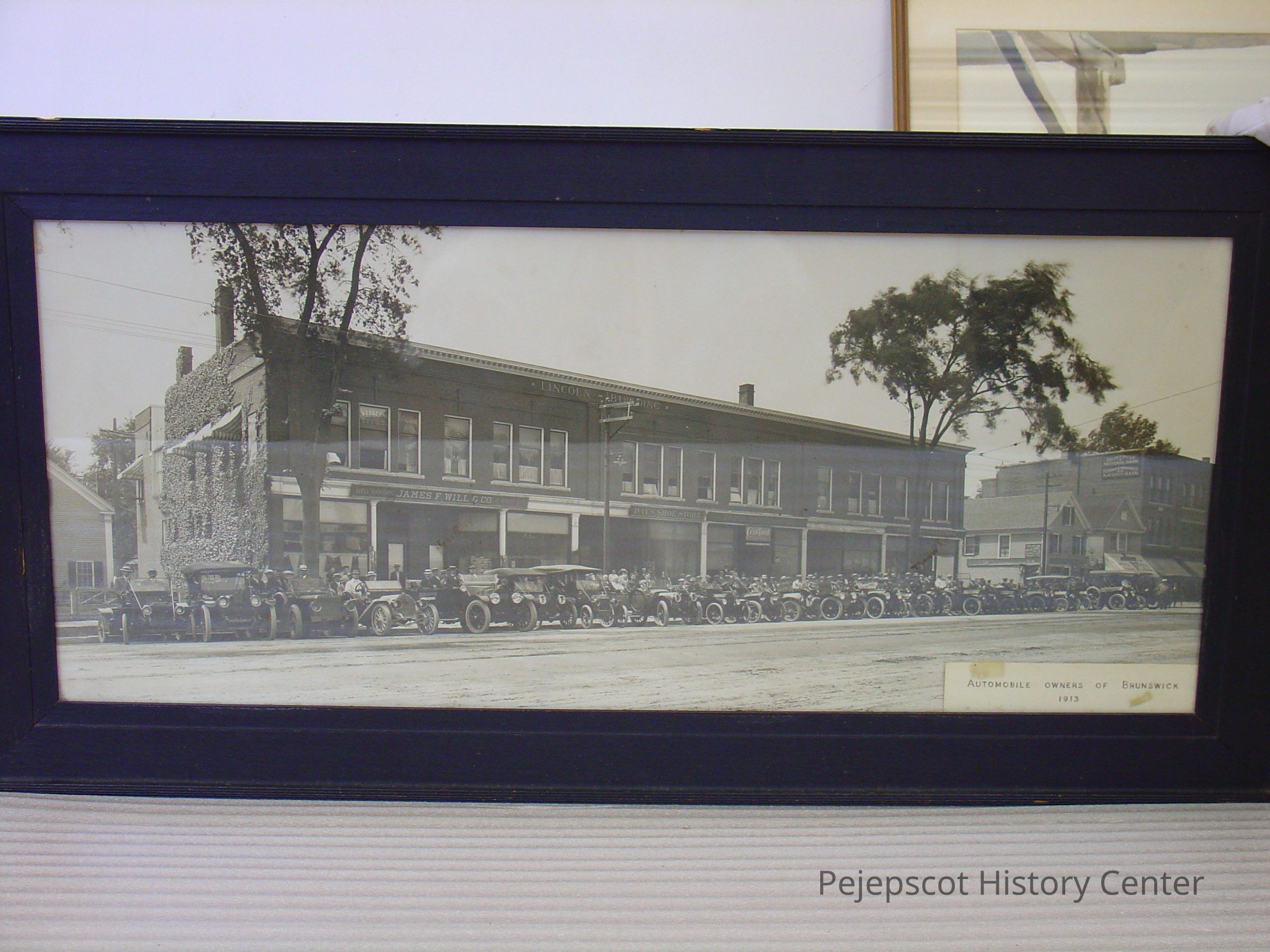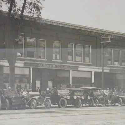 Automobile Owners - Brunswick, Automobiles, Brunswick, Lincoln Building, James F. Will & Co., Eaton Hardware, Day's Shoe Store, Webber's Studio, Watchmaker, Tailor, Cleaners, Drug store, Pejepscot National Bank, Cars, Architecture, Architecture - Brunswick, Streets - Maine, Topsham & Brunswick 25cent Savings Bank