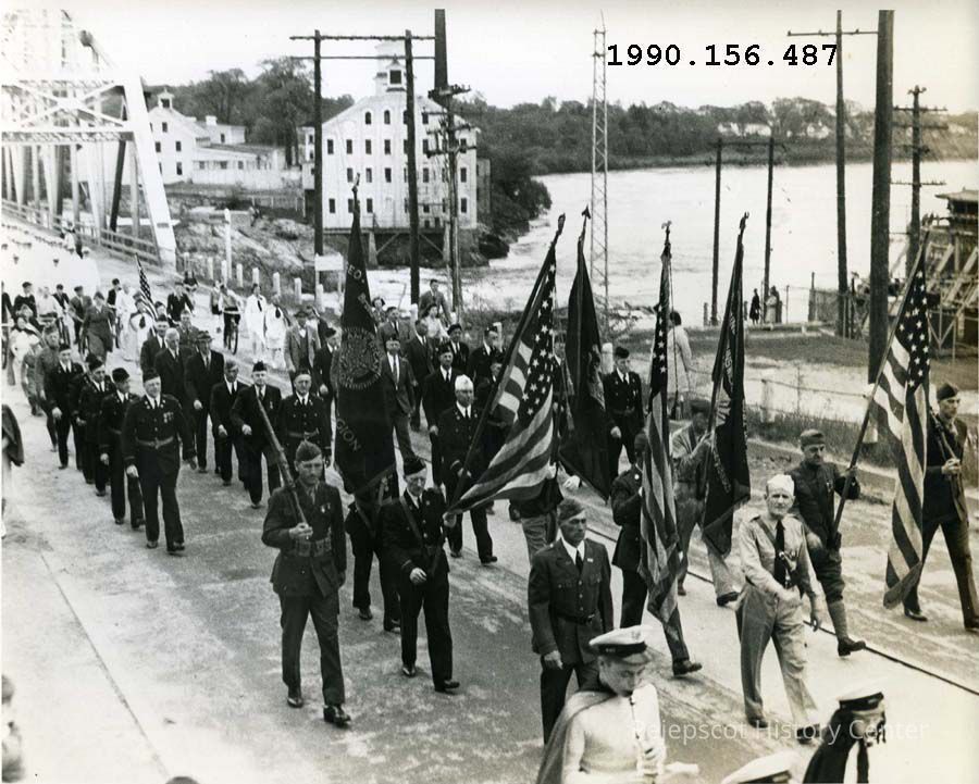 A B/W photograph of the Brunswick Bicentennial Parade crossing the Frank Wood Bridge. Eddie Morisette leading the Legion band. 1939