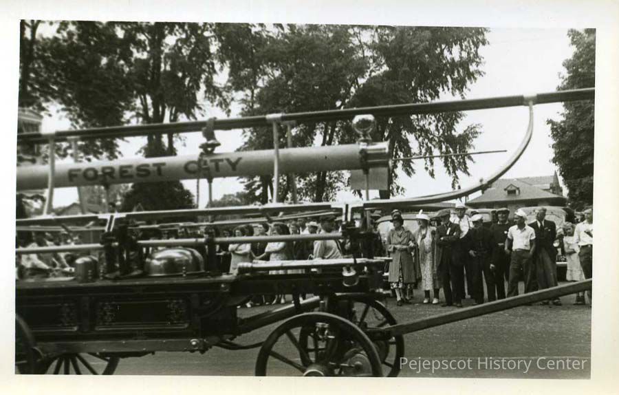 A black and white photograph of the Brunswick Bicentennial parade, featuring a fire engine. Dated 1939.