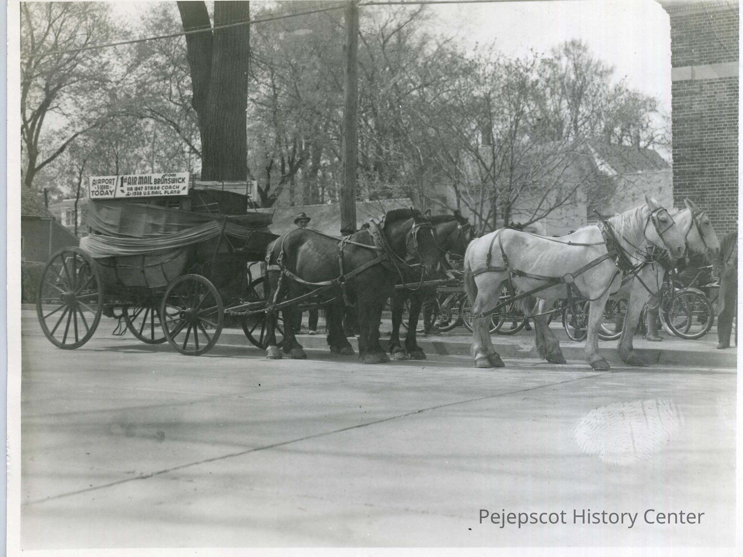 Four horses drawing an old stagecoach. Sign at top reads "Airport 3:30 pm Today/First Air Mail from Brunswick via 1847 Stagecoach, & 1938 U.S. Mail Plane." This coach appeared in the Brunswick Bicentennial Parade. Note on accession documentation reads, "4 horses drawing a wagon with back end to sign (sic) saying Air Mail. Bicentennial Parade." UndatedCollection