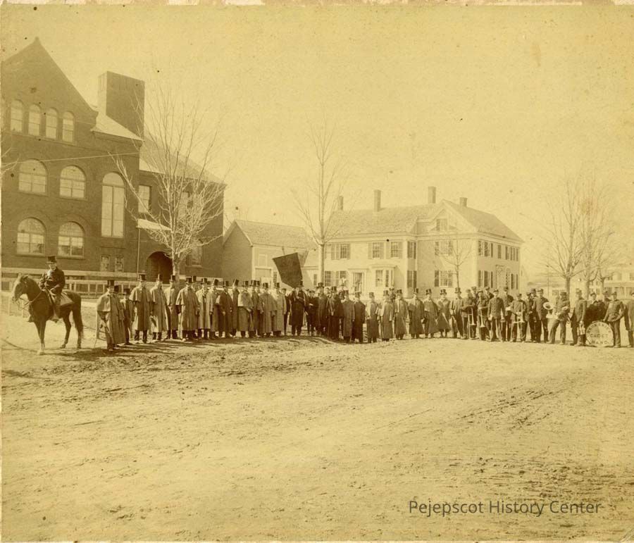 Sepia cabinet photograph of Brunswick Cadet Band in front of the High School on Federal Street, Brunswick, ME. No date.