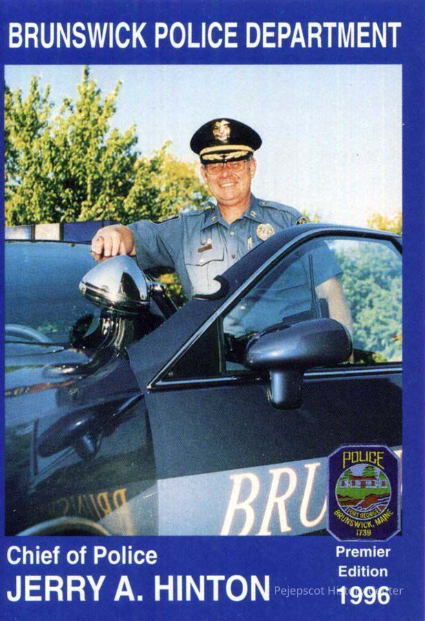 Color souvenir card of Police Chief Jerry A. Hinton, Brunswick Police Department, Brunswick, ME. On the back is a brief biography. 1996.