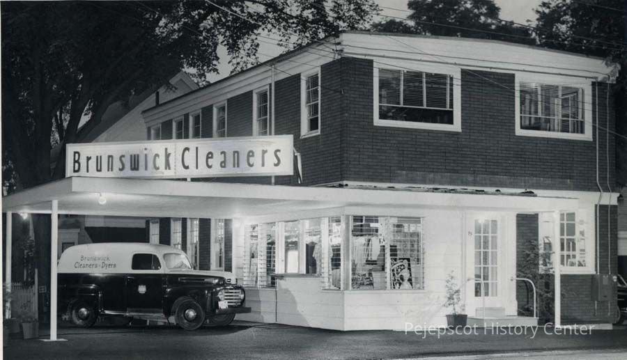 A B/W photograph of Brunswick Cleaners main office and plant. Located at 69-73 Maine Street, Brunswick, Maine. Dated 07/1955.