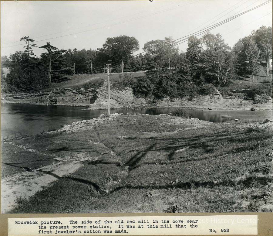 A black and white photo of the cove near the present power station. A note at the bottom of the photo says, "The side of the old red mill in the cove near the present power station. It was at this mill that the first jeweler's cotton was made." Undated