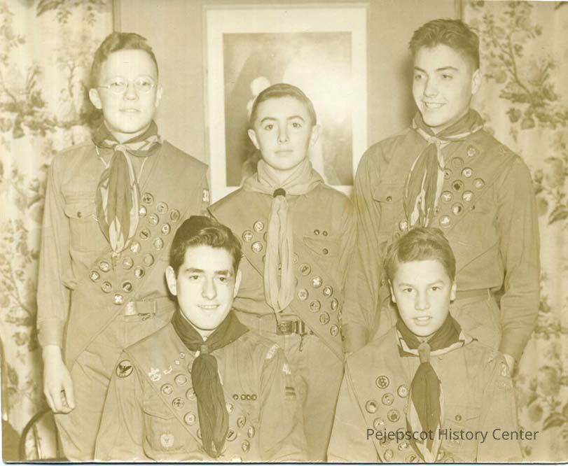 A group of Brunswick Eagle Scouts. In the front are Rudolph Delorimier and Harold Thalheimer and in the back room are Philip Wilder Jr., Sumner Holbrook, and Huston Dow. 1939