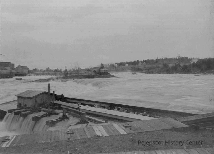A B/W photograph of the Brunswick Electric Power Station (Story electric power plant) during a flood. Suspension bridge to the station is still standing.