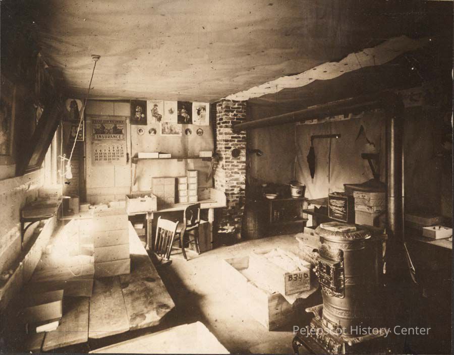 A B/W photograph of the interior of the Brunswick Factory room where first jewelry boxes were made. Undated
