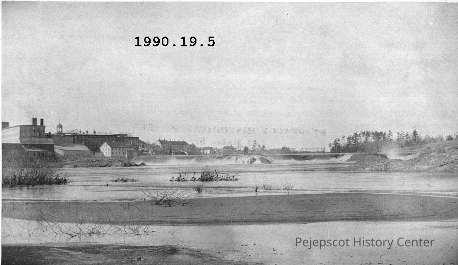 A B/W photograph of the Brunswick Falls in the Androscoggin River about 1888-1892. The Cabot Mill, Mill Tenements and Free Bridge can be seen.