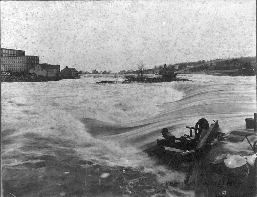 A B/W photograph view of Brunswick Falls in Brunswick, ME. Cabot Mill is visible in the back left. It looks like it was taken during a flood. Undated.