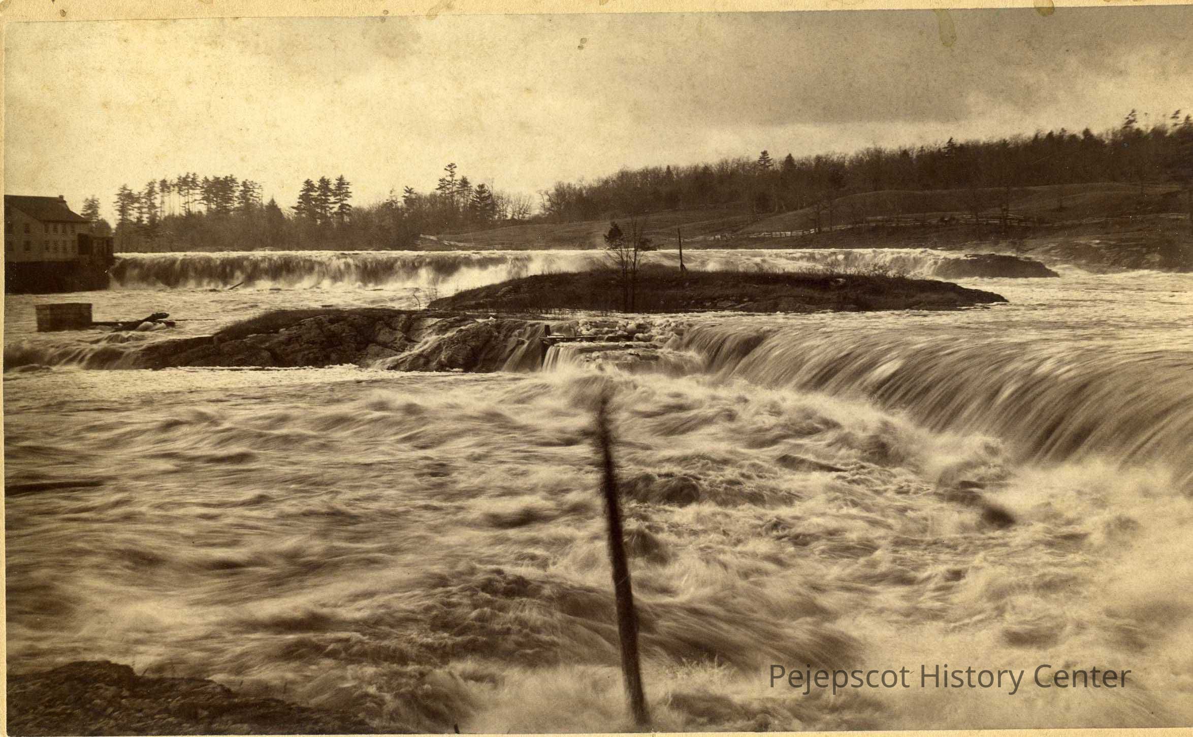 Mounted, black & white of early view of upper falls and river in freshet, looking toward Topsham shore--upper Summer Street.