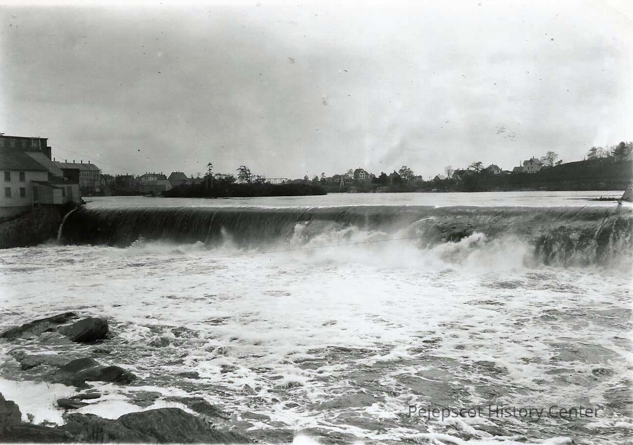 B/W photograph of the Androscoggin Falls in Brunswick, about 1910. The photograph was taken by Otis Card. Undated