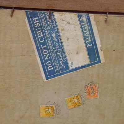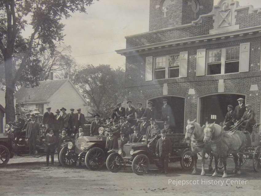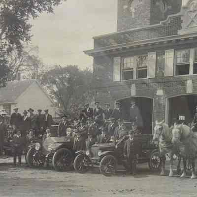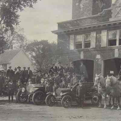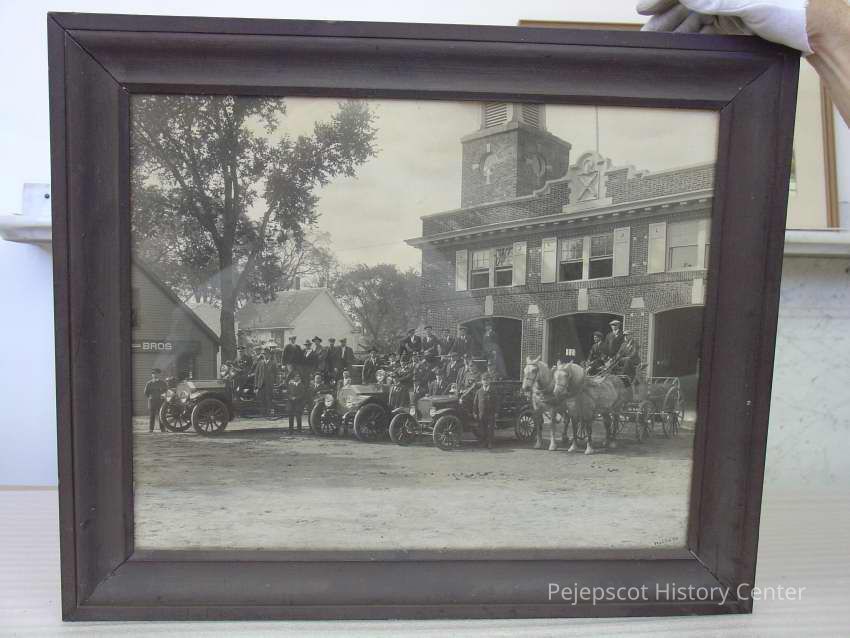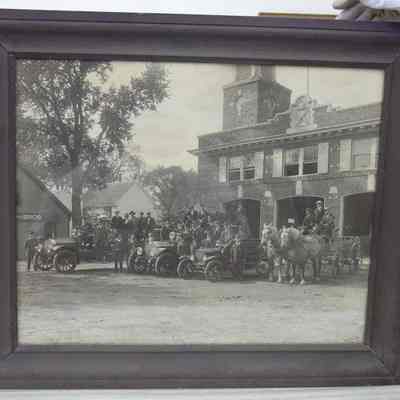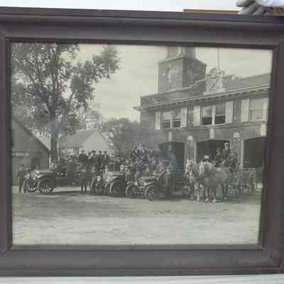 Framed B&W photo of The Brunswick fire brigade in front of its brick fire house. In addition to the men, it shows a hook and ladder and two pumpers with gasoline engines; and wagon (hose cart?) with two dapple gray horses hitched up. The photo is signed "Webber" in the lower right corner. The frame is plain wood painted black. Overall size: 52.25 cm h x 62.5 cm w x 2.25 cm d.