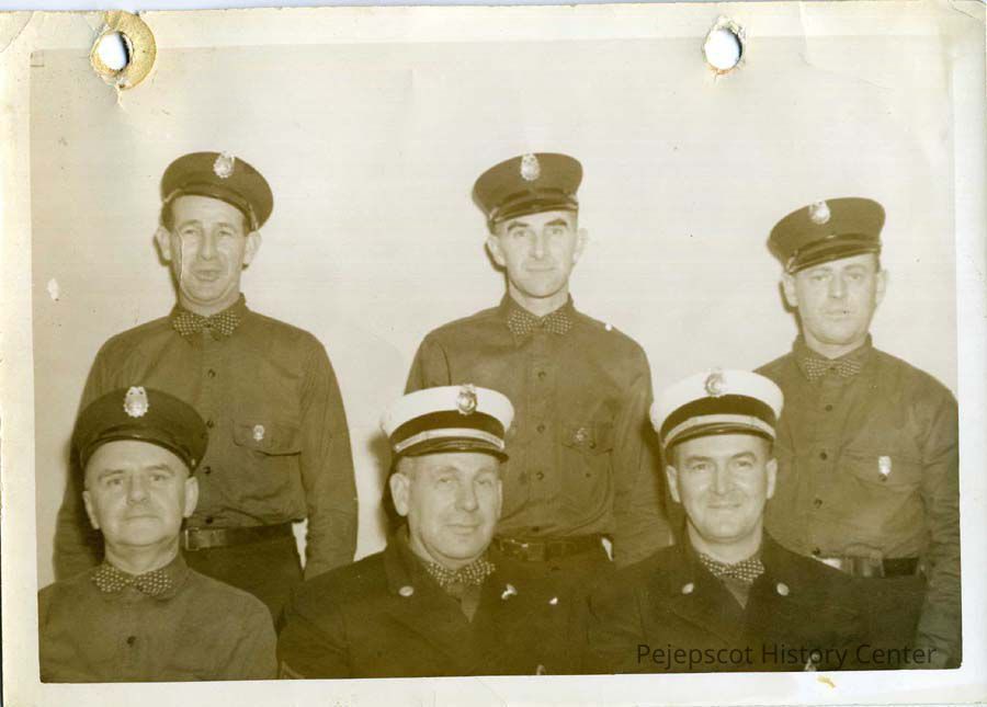 A black & white photograph of the 1945 Brunswick Fire Department. Sitting left to right: Captain Ludger Tetu, Chief Harold Nickerson, and Asst. Chief Ernest Sylvester. Standing left-to-right: Edward Nickerson, Kenneth Knight, and an unknown person.
