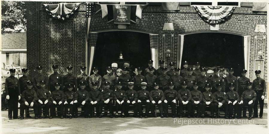 A B/W photo of the members of the Brunswick Fire Department in front of the station in 1939. One member identified as Billy Edwards, 9th from right, front row. Brunswick, Maine.
