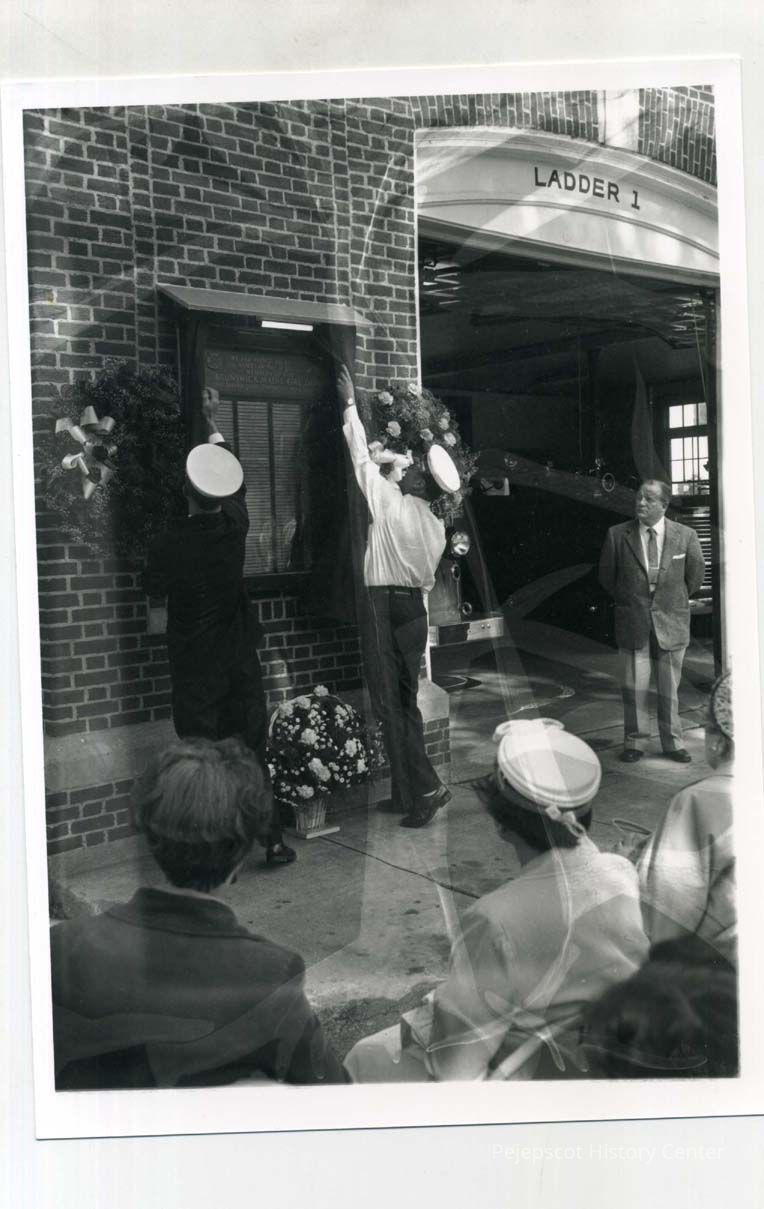 At a Brunswick Fire Dept. memorial service, two firemen hang wreaths on each side of a plaque on the outside of the fire station. A basket of flowers sits beneath the plaque. Jerry Wilkins stands in the open doorway of the station while people sit in chairs in front of the building