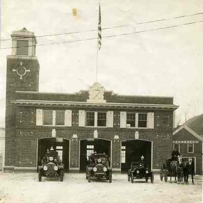 A B/W photo of the Brunswick central Fire Station in April 1920. Left to Right: