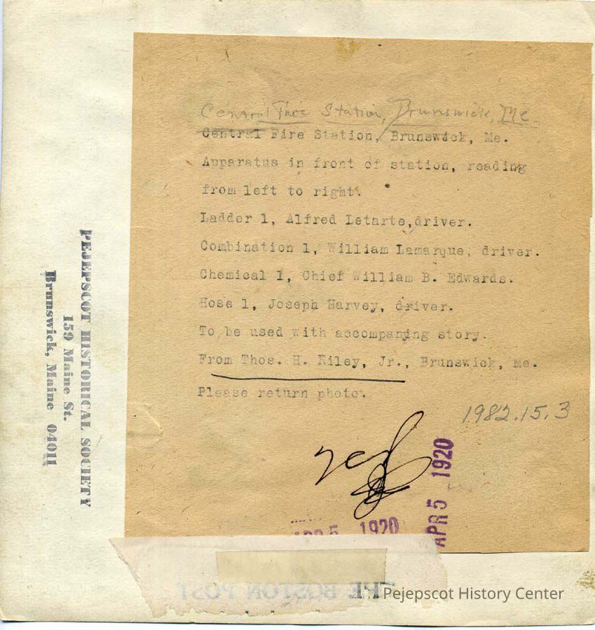 Ladder 1, Alfred Letarte, driver; Combination 1, William Lamarque, driver; Chemical 1, Chief William B. Edwards; Hose 1, Joseph Harvey, driver.Lexicon