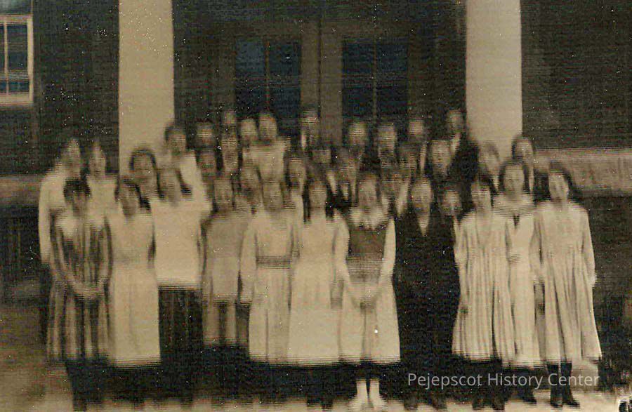 A B/W photo of Brunswick Grammar School Class of 1909.Gladys R Walker is in the back and has an "X" mark over her head. Marked on the back of the photo, "Brunswick Grammar School Class of 1909, Gladys R. Walker." Undated