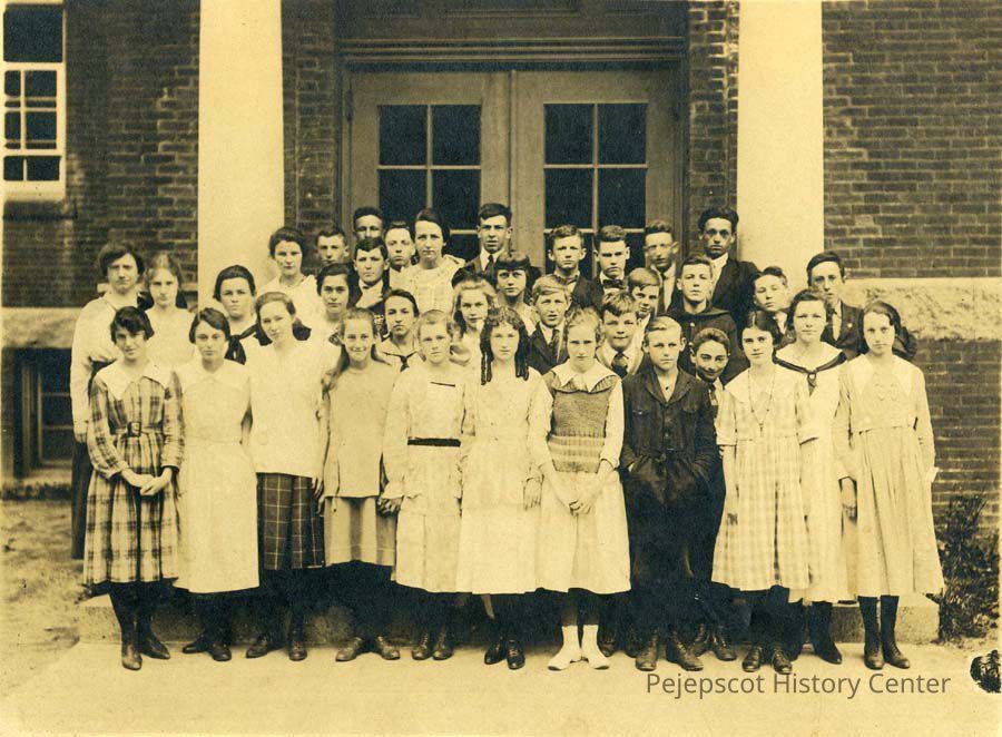 Black & white cabinet photograph on gray cardboard of Brunswick Grammar School Class of 1919. Students identified: Front row: Wilda Goodwin, Charlotte Corey, Marguerite Ormsby, Helen Richardson, Susan Harmon, Mildred Sutherland, Grace Rideout, James Morrell, Eleanor Randall, Martha Cony. Second row: Teacher Frances Craygin, Nevilla Blaisdell, Helen Roach, Mary Cairns, Maryon Rancour, Martha Senter, Henry Small, Frank Campbell, Lawrence Rosen, Madeline Footer. Third row: Celia Jean, David Desjardins, Gladys Walker, Evelyn Anderson, Sanford Williams, Herbert Crosman, Ernest Morse, Lorenzo Masse. Fourth row: Morris Singer, Charles Cairns (?), Harold Brehaut, Donald Lewis, Frank Walch, Brice Booker, Leon Soule, Seth Bamforth.Lexicon