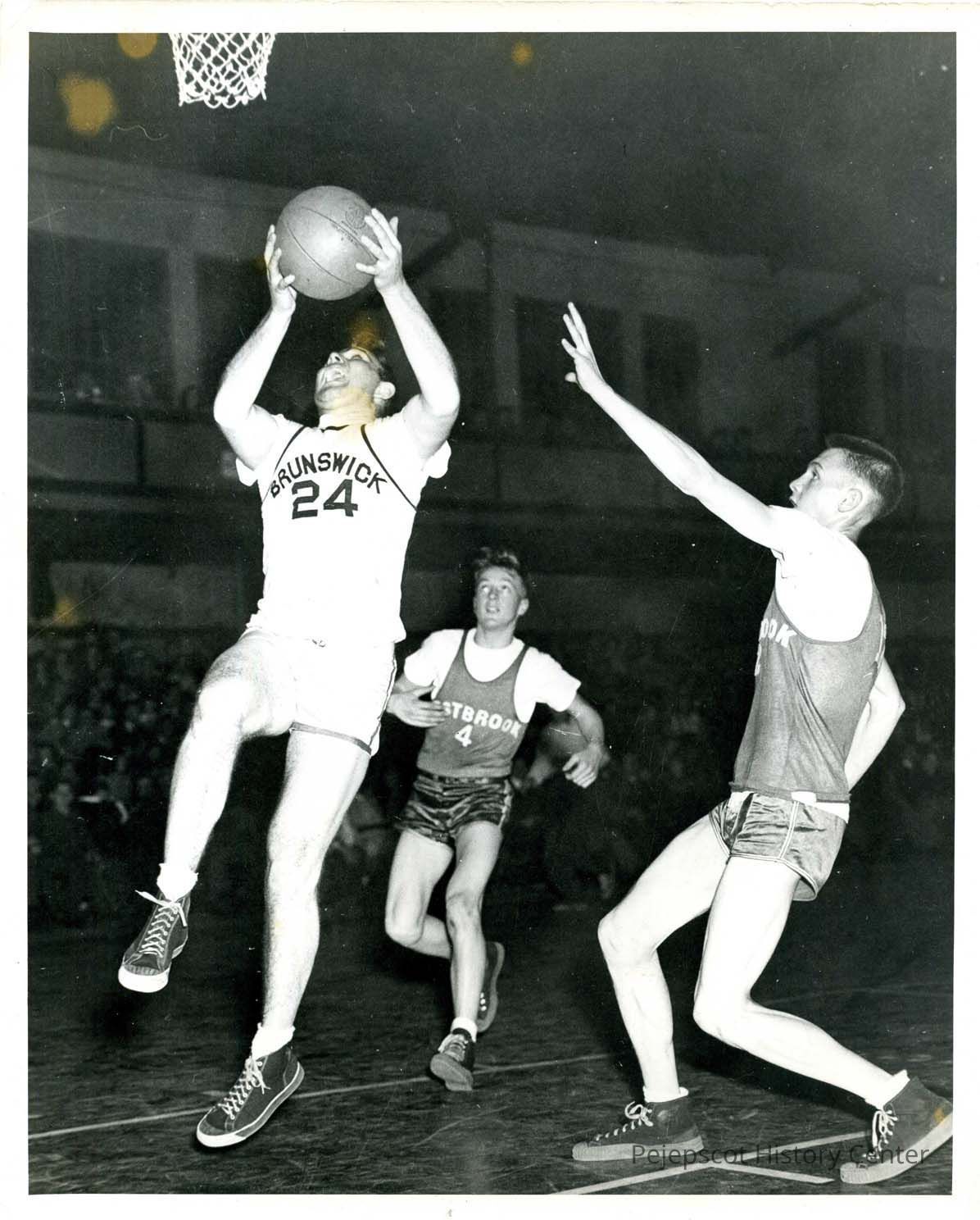 This photo shows three high school basketball players in action. The Brunswick High player is just about to shoot a basket while Westbrook High players look on. Undated
