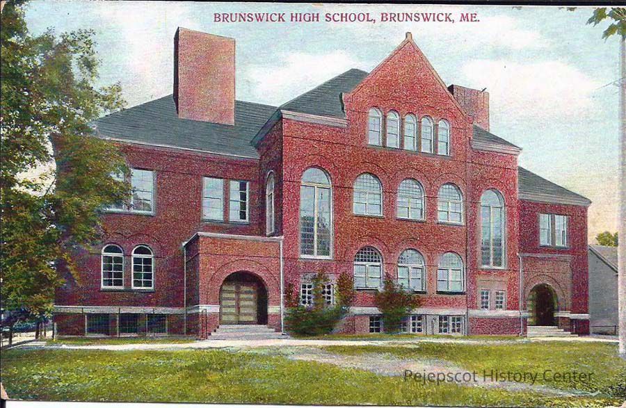 A color picture postcard of Brunswick High School which later became Hawthorne School.
